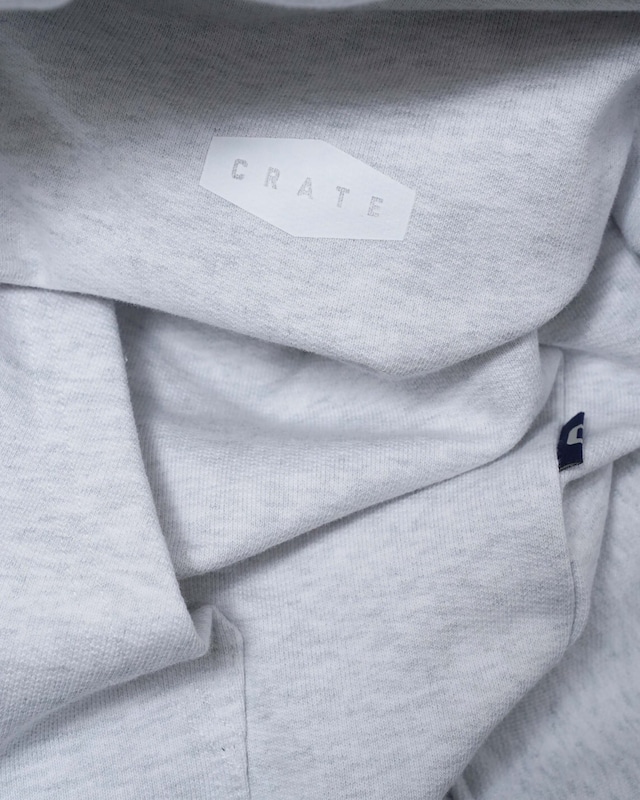 脇にピスネーム、フロントには限りなく主張を抑えたワンポイントロゴを配置。立体的な大きめのフードが存在感を生み、CRATEが新たなワードローブとして提案するフーディに。