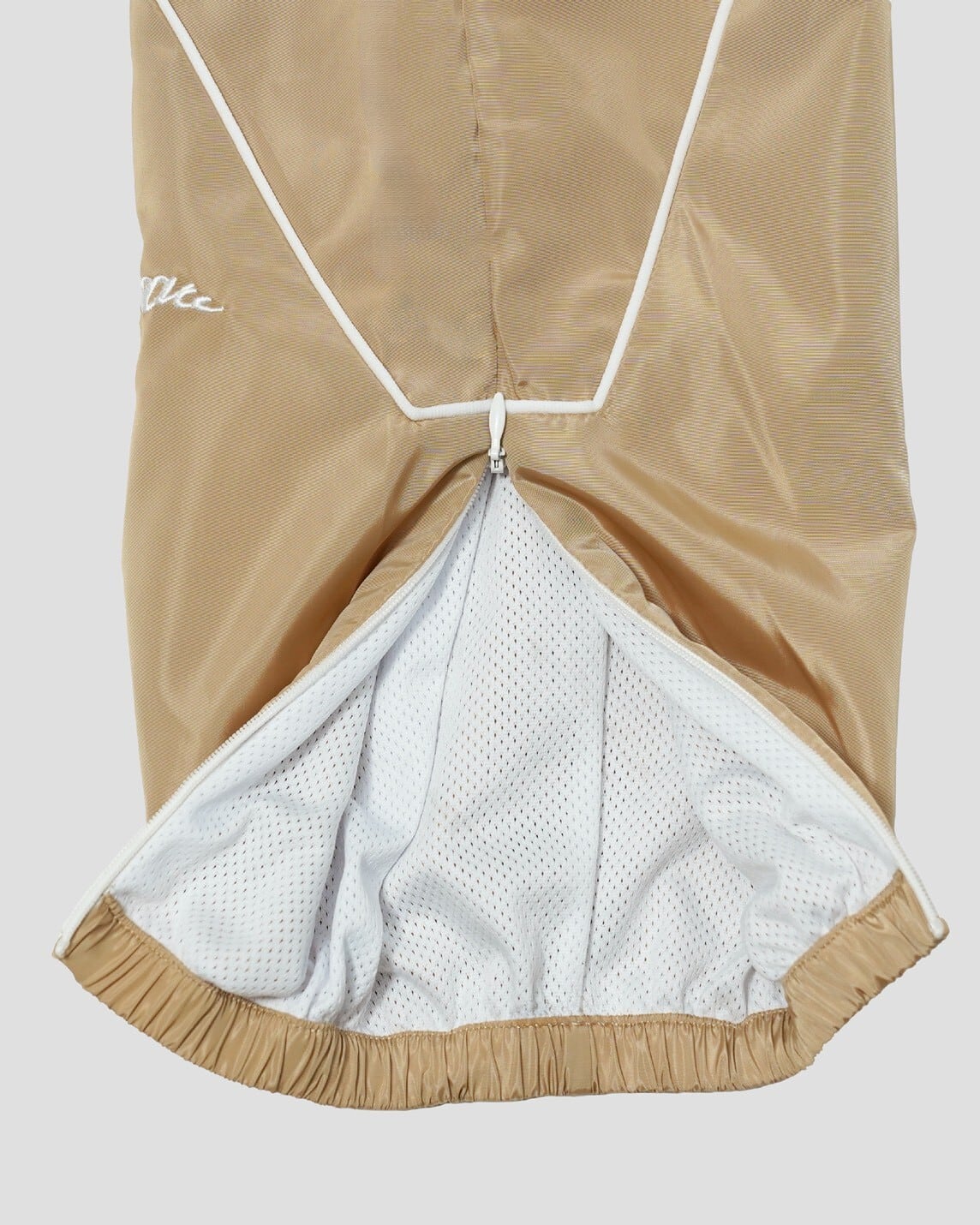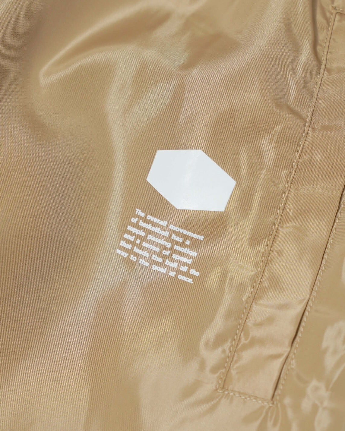 裾の内側にはジップ仕様を採用し、バスケットボールシューズを履いたままでもスムーズな脱ぎ着が可能な設計にしています。使用しているナイロン素材は、防風性・速乾性に優れ、非常に軽量かつ高強度。激しい動きにも耐えるタフな構造で、スポーツからアクティブな日常まで幅広く対応します。また、裏地にはメッシュ素材は肌離れの良さと快適な着用感を実現しました。