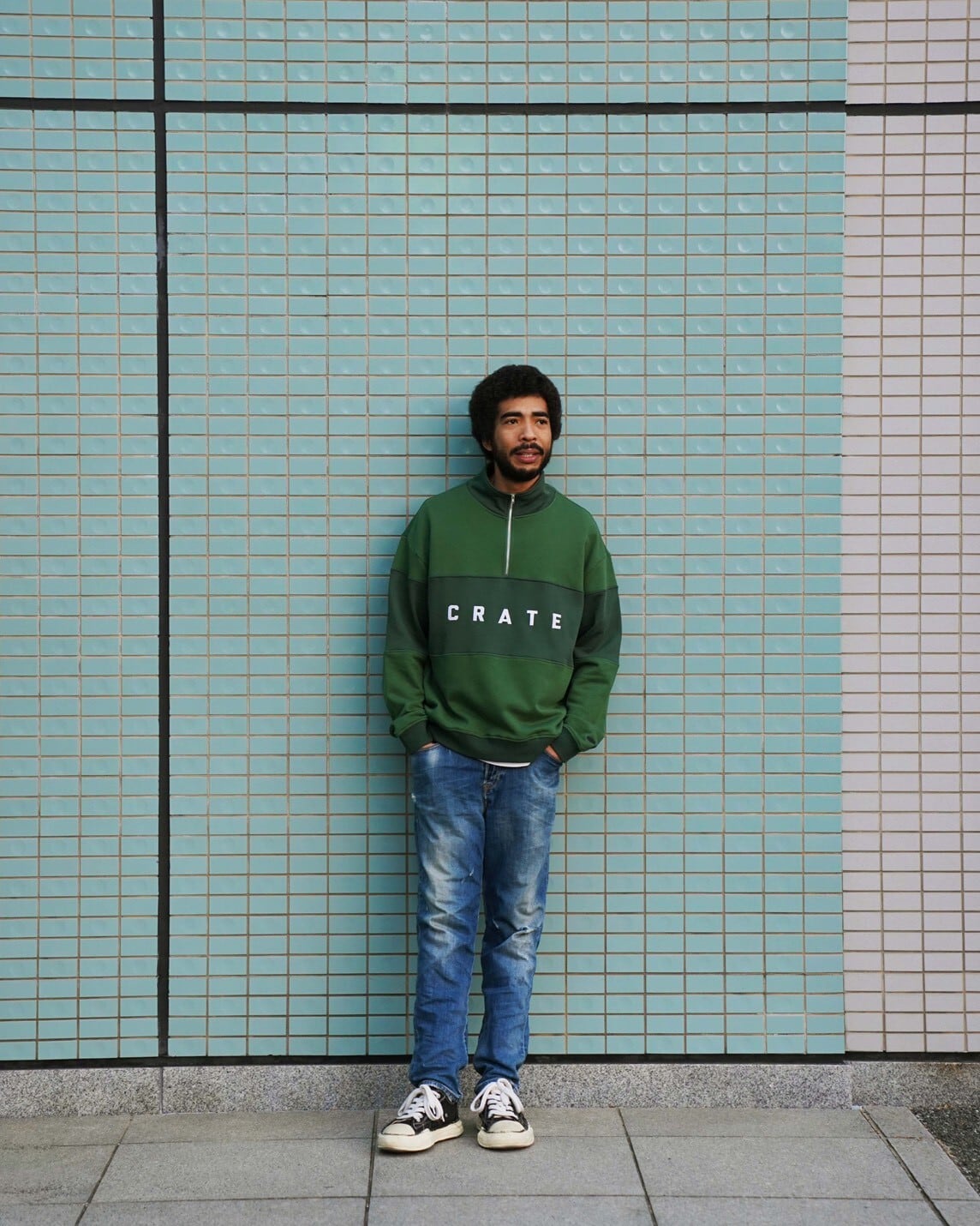 CRATEオリジナルのパターンメイキングで製作されたクォータージップスウェット。身幅にゆとりを持たせたリラックスシルエットで、単体でもレイヤードでもバランス良く着られる一着です。生地は330gsmの裏毛(コットンテリー)を使用。ソフトなタッチが特徴で、シーズンを問わず長く着用いただけます。フロントのロゴは刺繍。